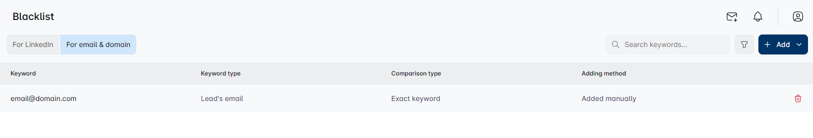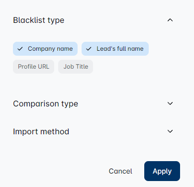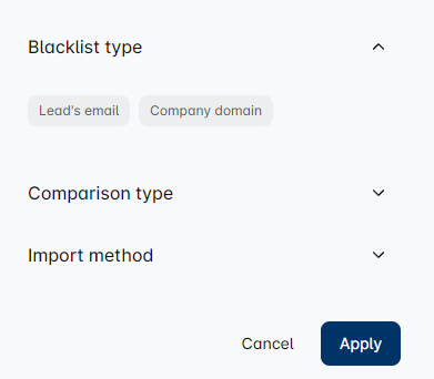 Type the email or company domain here, use Enter to separate the values, and choose the corresponding type (Lead's email or Company domain, depending on what you have written down) Choose your comparison type and click Add to Blacklist.